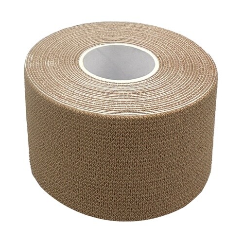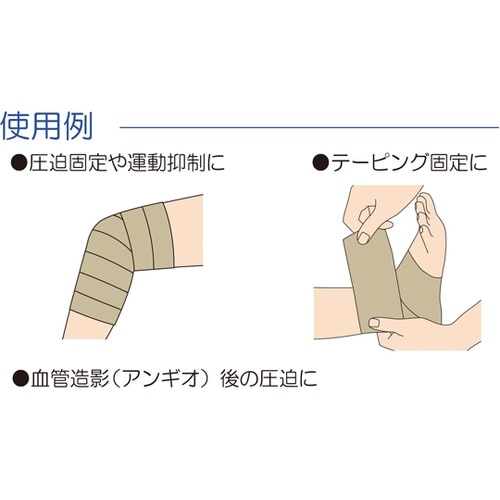 綿100%の強撚糸による弾力包帯。強撚糸による伸縮性(長さ方向)が圧迫・支持に優れている。粘着面の独自塗工により、通気性が良くムレにくい。アクリル系樹脂粘着剤のため皮膚への刺激が少ない。剥離紙(セパレ
