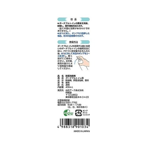 ポータブルトイレの悪臭を消臭し、菌を除菌します。 (すべての菌に効果があるわけではありません。) |