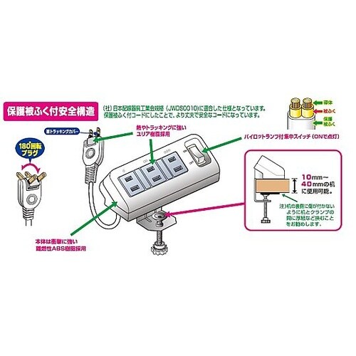 ネジ式クランプでデスク等に簡単に取り付けできます。差込口が斜めになっていますので、正面からのプラグの抜き差しが簡単に行えます。コードが下向きに出ていますので、机と壁の狭い所でもスッキリ配線ができます。 |