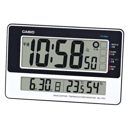 温度/ 湿度・日付表示付きの掛置兼用タイプの電波時計。お部屋の状態をアイコンでお知らせする生活環境お知らせ機能を搭載。大型でシンプルなデザインのため、表示内容が一目で確認できます。 |
