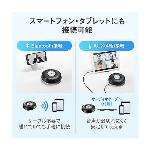さまざまなシーンで使える3種類(USB/Bluetooth/AUX(4極))の接続方法4つのマイクで360°集音できる会議に最適なBluetoothスピーカーフォン。優れた音声処理機能のエコー&ノイズ |