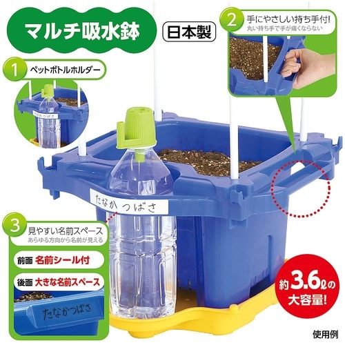 吸水方法が選べる多機能鉢!マルチ吸水鉢!あさがおの栽培ができるセットです。鉢と受け皿、ジョローキャップ、あさがおの種、追肥、虫めがねがセットになったスターターキットです。受け皿がついているので、場所を |