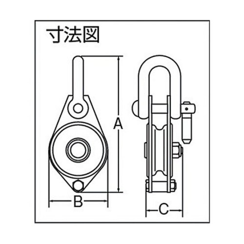 頭部はシャックル式です。シーブはベアリング入りです。ロープを通し、荷物などの吊り上げや引っ張り作業。 |
