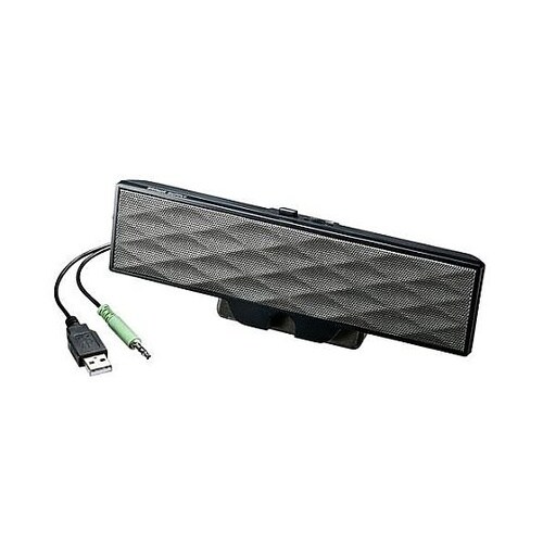 クリップでノートパソコン上部に挟んで固定したり、ディスプレイ下部などにも設置ができるUSB電源供給のサウンドバースピーカーです。 |