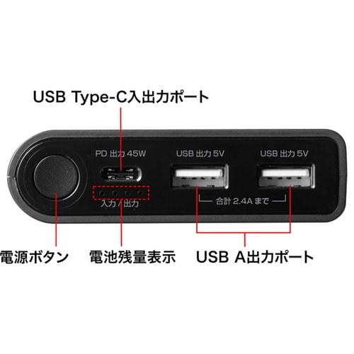 USB Power Delivery(USB PD)規格による最大45Wの出力に対応し、USB Type−Cポート搭載のノートパソコンへ充電ができる容量20100mAh(並列換算値)のモバイルバッテリ |