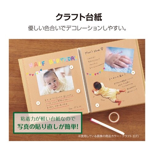 思い出をより素敵に残そう。手軽に簡単手作りアルバム。表紙にフォトフレーム付き。クラフト色台紙▼優しい色合いでデコレーションしやすいクラフト色台紙採用。表紙にフォトフレーム付▼L判写真を表紙のフォトフレ |