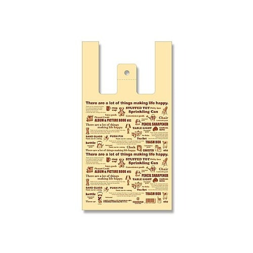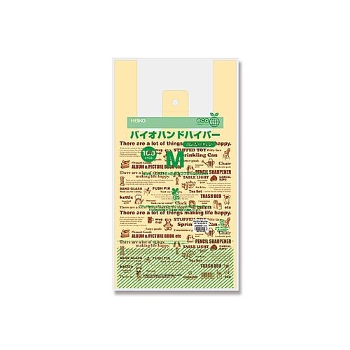 生物由来の有機資源を原料としたバイオマス成分を25%含んだレジ袋です。日用品のイラストと英文を組み合わせた使いやすいデザインです。バイオマスマーク取得済みで、「プラスチック製買物袋有料化制度」の対象外 |