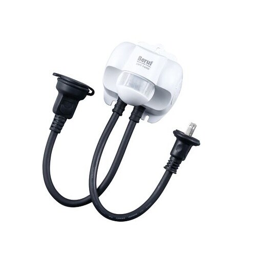 センサーが感知し、接続されたものに電源が入ります。雨に濡れてもOK!(IP65)最長約10m×180度の広範囲センサー。人などの動く熱源(赤外線)を感知します。 |
