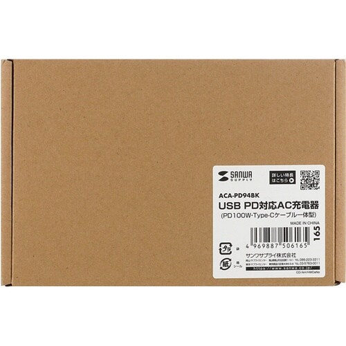 USB PD対応AC充電器(PD100W・TypeCケーブル一体型) ACA−PD94BK