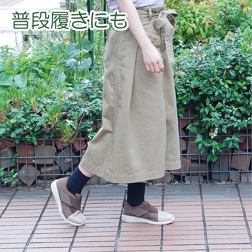 安定した歩行をサポートする室内外兼用シューズです。普段履きにも使えるツートーンカラーのおしゃれでカジュアルなデザインです。足幅4E、足囲3.5Eとゆったり設計で足のストレスを軽減し、中敷を取り外すと足