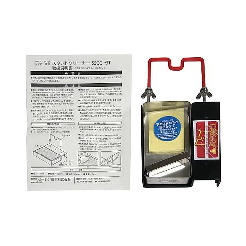 安全に作業するために、クロスメディアカッターのコテ受け台として使用します。耐熱スポンジを使用して、カッターの刃先に付着するカスを拭き取り、刃先をキレイに保つことができます。 |