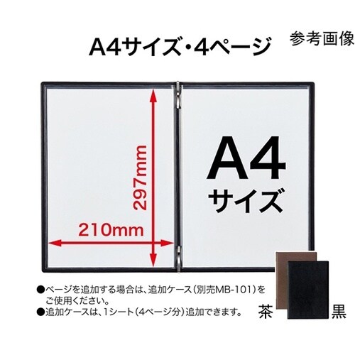 高級感のあるレザー調です。追加ケース(MB−101)は最大1シート(4ページ)追加できます。 |