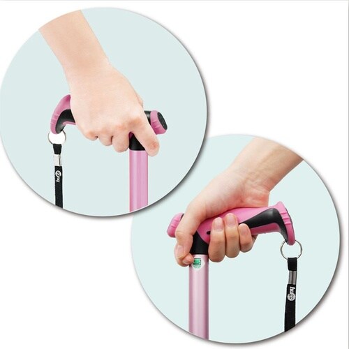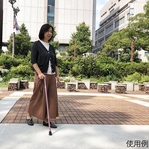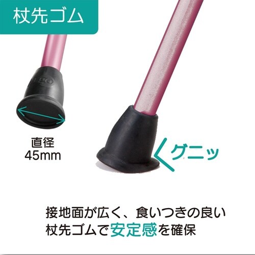 左右どちらでも握りやすいグリップ形状です。クッション付きのグリップが手にかかる衝撃を和らげます。杖先ゴムが裾広の形状で接地面への食いつきが良く、安定性に優れています。