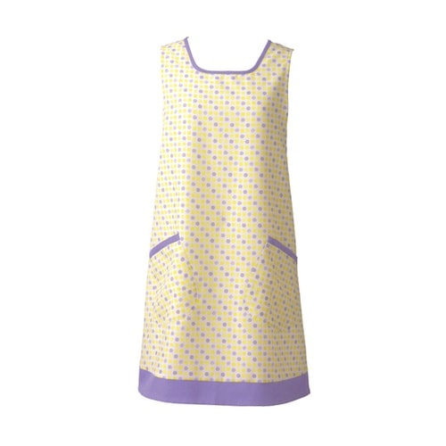 さっと脱ぎ着できる、かぶり型のエプロンです。お尻のラインが隠れる安心な丈。左脇のスナップボタンで着脱簡単!明るいドットにアクセントの斜めポケットがついています。ハリがありシワになりにくい薄手の織物素材
