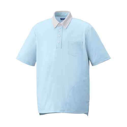 ボタンダウンのクレリックカラーポロ美しい着こなしのためのサイズバリエーション割れにくい白のシリコンボタンで爽やかな印象に。後ろ衿中央に配色使いのこだわり。胸ポケットには名札やクリップライトを付けられる |