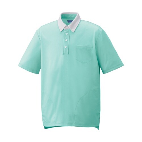 ボタンダウンのクレリックカラーポロ美しい着こなしのためのサイズバリエーション割れにくい白のシリコンボタンで爽やかな印象に。後ろ衿中央に配色使いのこだわり。胸ポケットには名札やクリップライトを付けられる