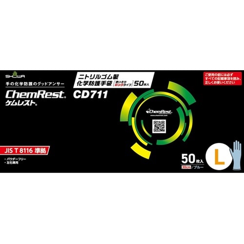ニトリルゴム製化学防護手袋 使いきりロングタイプ L ブルー 1箱(50枚入) CD711−L
