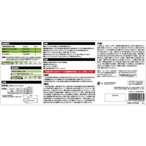 JIS T 8116に準拠した化学防護手袋です。低濃度の酸性・アルカリ性の薬品の透過を防ぎ、経皮吸収のリスクから作業者を保護します。全長30cm ロングタイプのニトリルゴム製使いきり化学防護手袋です。 |