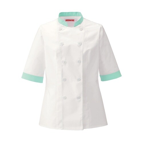 店舗空間を明るく演出するマカロンをイメージしたレディスコックシャツ。女性に特化させたサイズ&シルエットなのでスタイリッシュに着用して頂けます。清潔感のある白をベースに、マカロン色を衿・袖口・ボタンホー