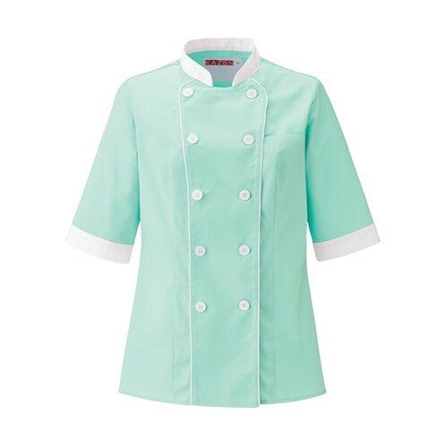 マカロンをイメージした甘く優しい雰囲気にまとめたパフスリーブのレディスコックシャツ。マカロン色をベースに、衿・袖口、フロントパイピングテープ・ボタンを白配色にした可愛さ溢れるデザインです。