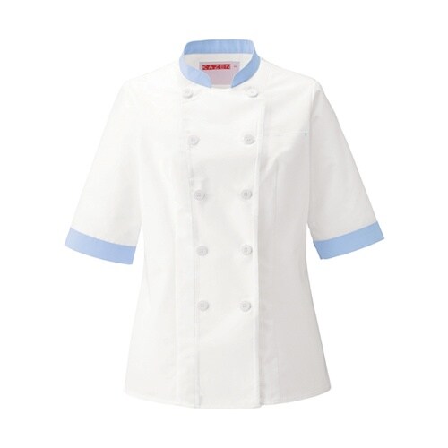 店舗空間を明るく演出するマカロンをイメージしたレディスコックシャツ。女性に特化させたサイズ&シルエットなのでスタイリッシュに着用して頂けます。清潔感のある白をベースに、マカロン色を衿・袖口・ボタンホー