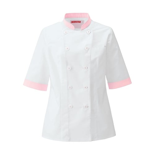 店舗空間を明るく演出するマカロンをイメージしたレディスコックシャツ。女性に特化させたサイズ&シルエットなのでスタイリッシュに着用して頂けます。清潔感のある白をベースに、マカロン色を衿・袖口・ボタンホー