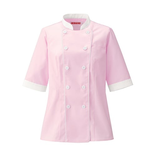 マカロンをイメージした甘く優しい雰囲気にまとめたパフスリーブのレディスコックシャツ。マカロン色をベースに、衿・袖口、フロントパイピングテープ・ボタンを白配色にした可愛さ溢れるデザインです。
