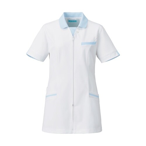胸元のカラーフラップがデザインのアクセント。さりげなく胸元の開きをカバーします。白を基調に優しいパステルカラーが親しみやすさと安心感を与えます。