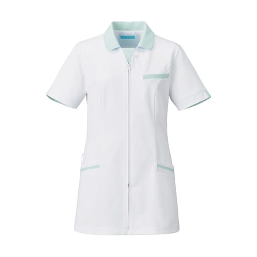 胸元のカラーフラップがデザインのアクセント。さりげなく胸元の開きをカバーします。白を基調に優しいパステルカラーが親しみやすさと安心感を与えます。 |