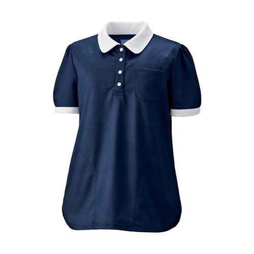 パフスリーブが特徴のレディスポロ胸ポケットには名札やクリップライトを付けられるループ付。ポケット口の伸びを防止します。スッキリとした印象でしっかり物が収納できる両腰のスリットポケット。丸衿や袖、背面に