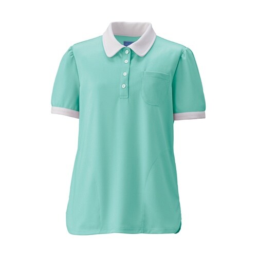 パフスリーブが特徴のレディスポロ胸ポケットには名札やクリップライトを付けられるループ付。ポケット口の伸びを防止します。スッキリとした印象でしっかり物が収納できる両腰のスリットポケット。丸衿や袖、背面に