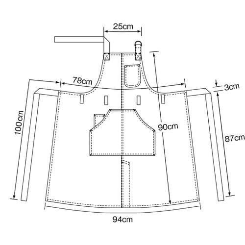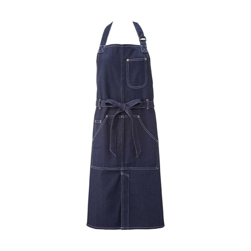 着脱が手軽な首掛けタイプでウエスト前結びのカジュアルな胸当てエプロン。前中心の裾にはスリットを入れて、足さばきにも配慮しました。 |