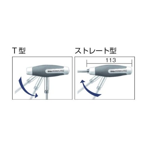 力を必要とするねじの取り外し作業に適しています。1つのドライバーでストレートとT型の2種類の使い分けができます。 |