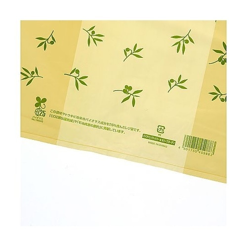 生物由来の有機資源を原料としたバイオマス成分を25%含んだレジ袋です。オリーブをモチーフにしたナチュラルテイストのデザイン。バイオマスマーク取得済みで、「プラスチック製買物袋有料化制度」の対象外とする |