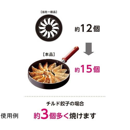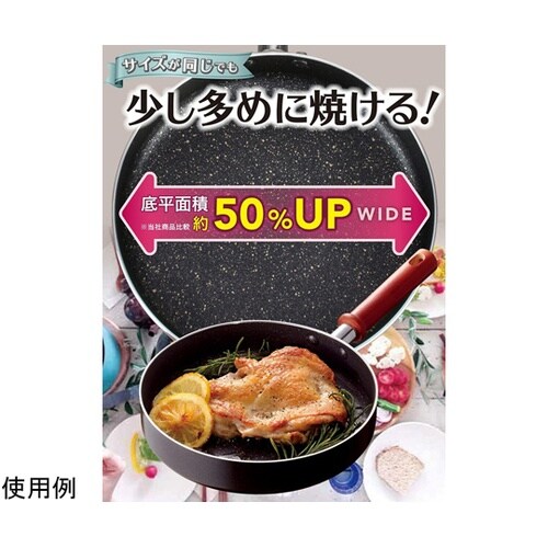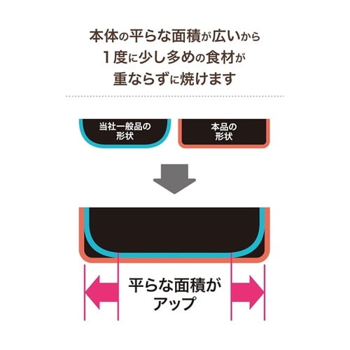 本体の平らな面積が広いから一度に多くの食材が重ならずに焼けます。内面はこびりつきにくく、金属ヘラが使えるダイキン工業製「シルクウェアEL」マーブルコーティング |