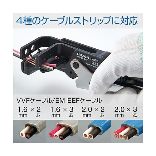 1.6/2.0mm×2芯、1.6/2.0mm×3芯のケーブル外装ストリップと芯線被覆ストリップに対応。被覆のカットから剥ぎ取りまでハンドルを握るワンアクションで行えます。 |