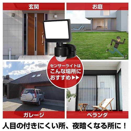 暗闇でセンサーが人や車の動きを検知して自動点灯軒下などの屋外にも設置できる防雨仕様(IP44防沫形)LEDなので省エネなのに明るい低赤外線・低UVで発熱が少なく虫も集まりにくい光