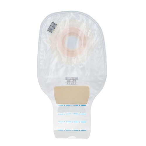 消化管ストーマ用。面板に硬い凸型のプレートが内蔵されており、高さのないストーマに適しています。下部に便排出口があるストーマ袋です。交換目安は2日。面板には、しなやかで耐久性のある薄型皮膚保護剤を使用し |