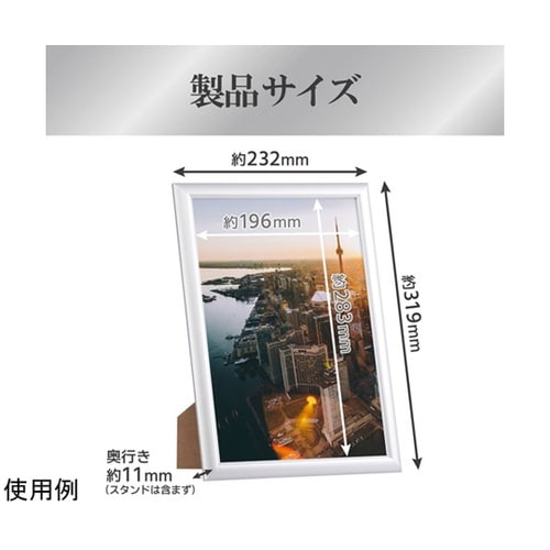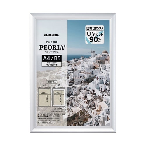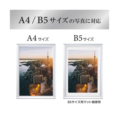 UVカットPET板を使用したシンプルなデザインのA4サイズ用アルミ額縁。B5サイズも飾れるマット紙(中額)付き。 |
