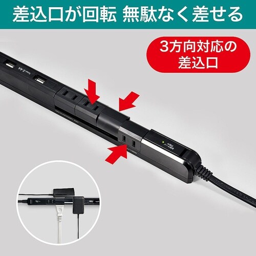 スマートフォンを2台同時充電可能(USBポート)差込口が回転することで、無駄なく差せる雷から接続機器を守る耐雷サージ機能付耐トラッキングカバーで電気火災を予防コードが上下180°に回転、ラックや壁面に |