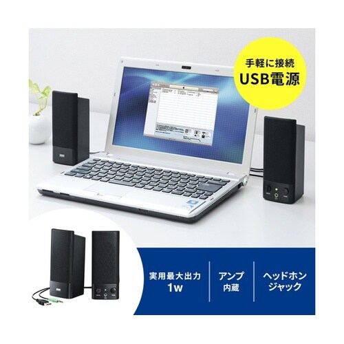 実用最大出力1W(0.5W+0.5W)のマルチメディアスピーカーです。アンプ内蔵でヘッドホンステレオの出力端子やパソコンの音声端子につなぐだけで音楽を楽しめます。USBポートから電源を供給するのでコン |