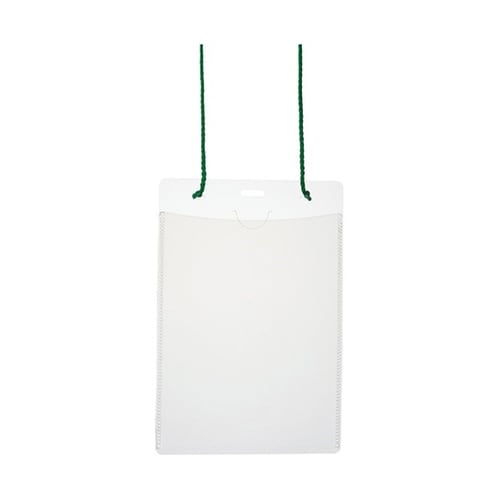 はがきサイズがぴったり入る吊り下げ式イベント名札中身を出し入れしやすいソフトタイプカードケース負荷が生じると紐がケースから外れる安全機能付き素材はオレフィン系素材(紐はPET繊維)で、焼却しても有害な |