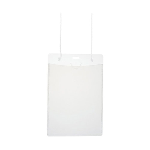 はがきサイズがぴったり入る吊り下げ式イベント名札中身を出し入れしやすいソフトタイプカードケース負荷が生じると紐がケースから外れる安全機能付き素材はオレフィン系素材(紐はPET繊維)で、焼却しても有害な |