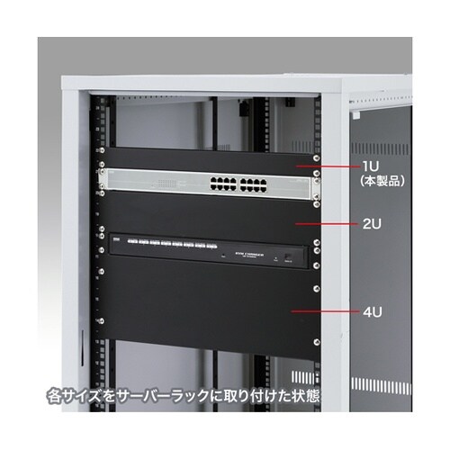 19インチマウントラックの前面をカバーします。前面に取り付けることにより、熱気が背部から前面へ回り込むのを防ぎます。 |