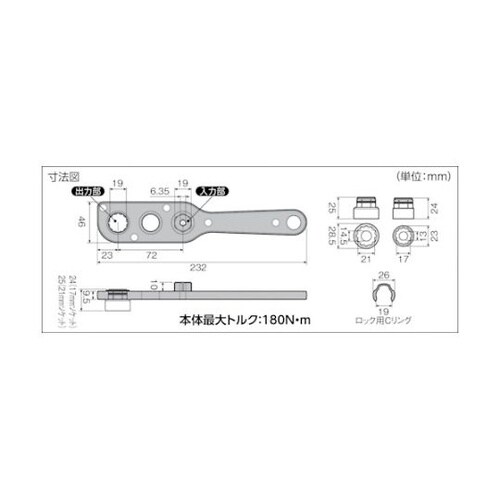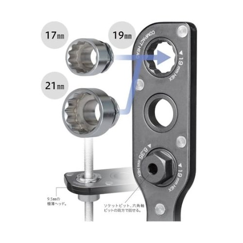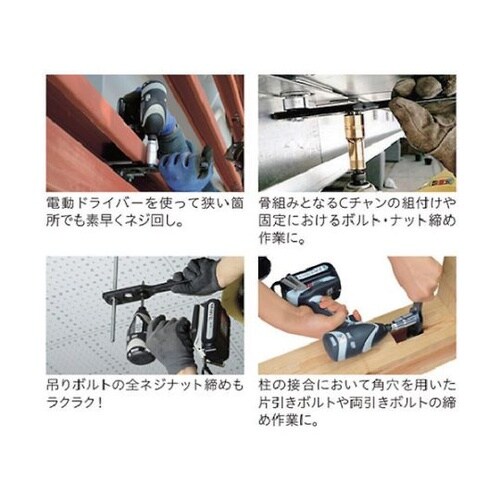 対辺17、19、21mmのボルト・ナットに対応しています。オフセットアダプターを使って電動ドライバーで狭い所でのボルト・ナット回しが素早くできます。出力部は六角対辺19mmに対応、入力部は六角対辺19 |