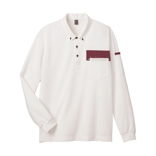 綿混で肌触りのよい鹿の子素材を使ったボタンダウンタイプの長袖ポロシャツ。デザインアクセントと補強を兼ね備えたポケット口の配色デザインが特徴。脇下のシームは内側に消臭テープを縫い付け、快適な使用感を実現 |