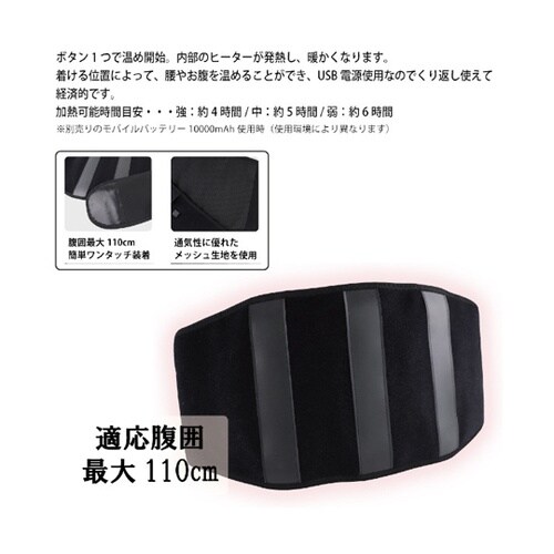 巻き方を変えれば、腰はもちろんお腹も温められます女性の冬の強い味方モバイルバッテリー(別売)を使用すれば外出先でもどこでも使えます通常はサポーターとしても使えます通気性に優れたメッシュ生地を使用ボタン |