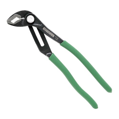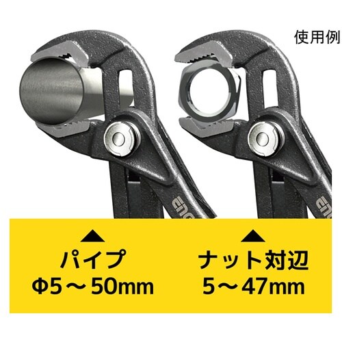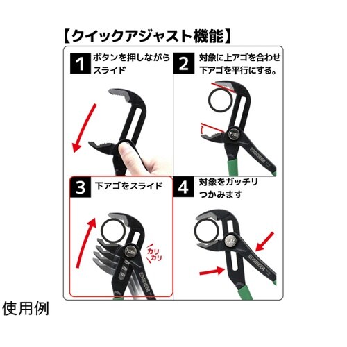 ネジ外し機能を搭載した、クイックアジャスト機能付きウォーターポンププライヤー。スムーズなクイックアジャスト機能搭載で、グリップをスライドさせるだけで開き幅を調整できます。潰れたネジ、錆びたネジを先端の |