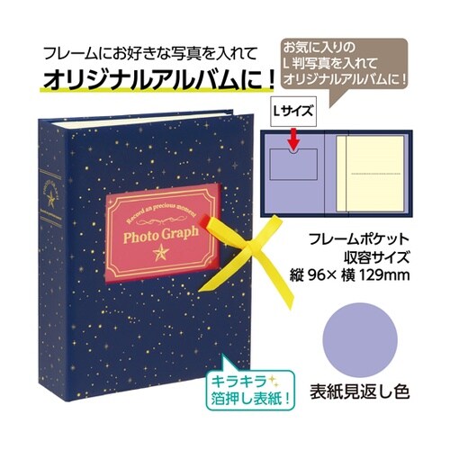 表紙がフォトフレームになったポケットアルバム。Lサイズの写真が200枚収容できる大容量タイプ。表紙はキラキラ光る星柄のデザイン。フレームの中には、金色の箔押し付のPOPカード入り。お気に入りの写真を表 |