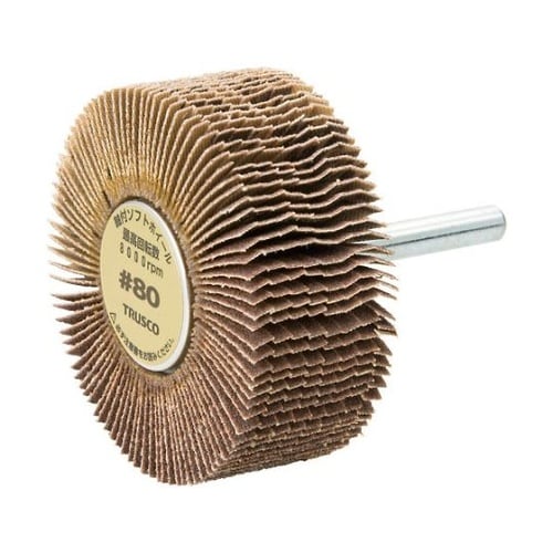 一般金属用です。研磨布に細かくスリットしてあるため、細かい部所の研磨はもちろん、凹凸面研磨に適しています。「自生作用」により、目づまりしません。ソフトタッチの研磨ができます。軸付フラップの持つ特性を保 |